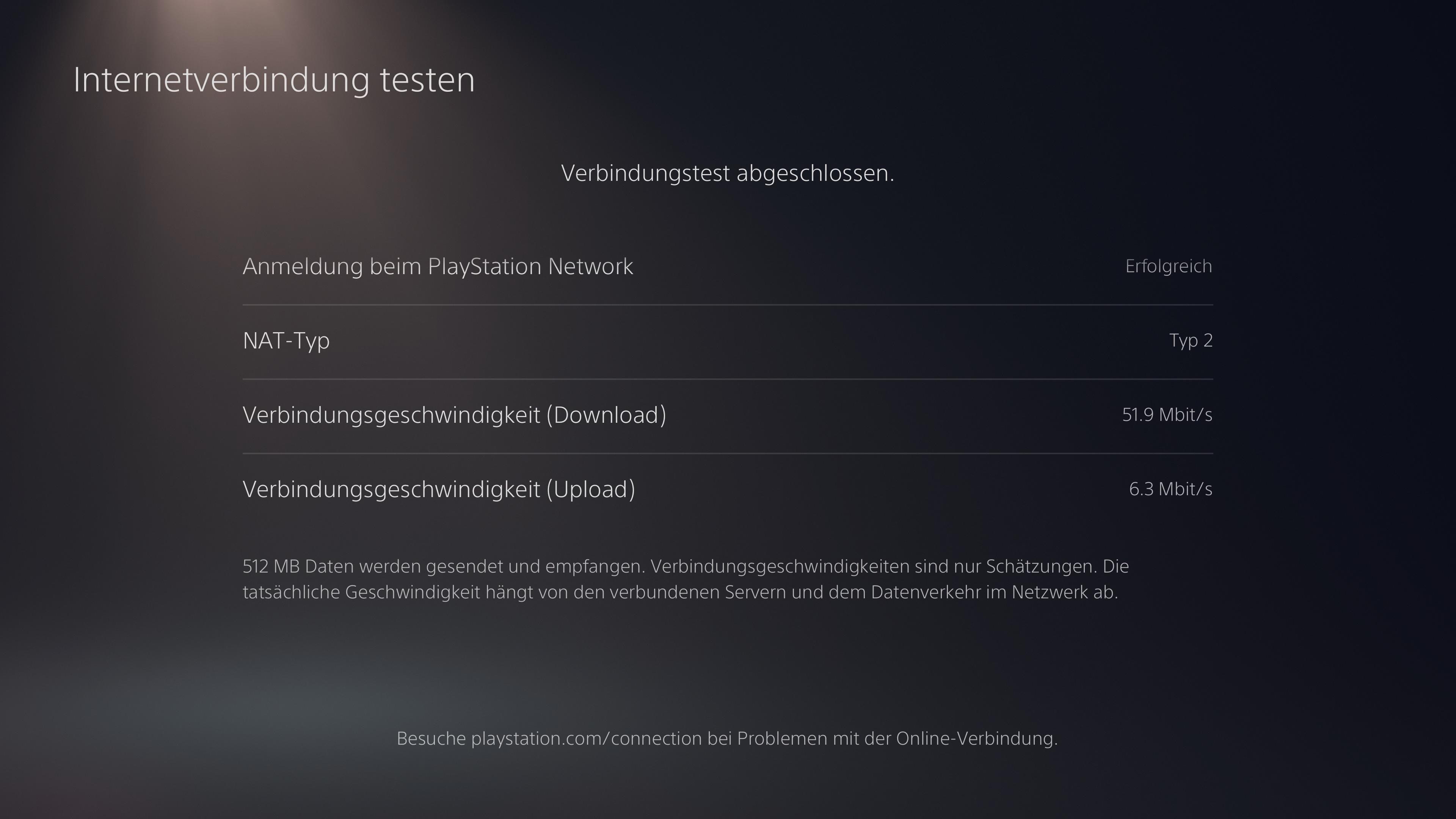 So eben mal ein Verbindungstest mit der PS5 gemacht, siehe Screenshot. Ganz wichtig ist allerdings der Hinweis, dass die Verbindungsgeschwindigkeit geschätzt wird. Daher werden die Angaben der Konsole nie der Realität entsprechen.