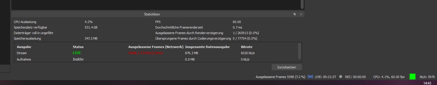 Die ausgelassene Frames (bei Netzwerk) bereiten mir Bauchschmerzen und ich bekomme es einfach nicht im Griff das ich mal ein Abend ein sauberen Stream Abend habe mit 0 Fehler. Das es generell an Twitch liegt schließe ich aus weil ich vorhin ein Test Stream auf YT hatte und dieser hatte nach 30 Min auch schon Fehler gehabt.