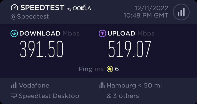 Das Schöne hier ist, bei uns sind sehr wenige Kabelkunden von Vodafone und ganz gleich ob Wochentag oder Wochenend, Down- und Upload sind wirklich immer am Maximum. Ich kenne Kollegen, die ebenfalls bei Vodafone sind, bei denen sieht das ganz anders aus.
