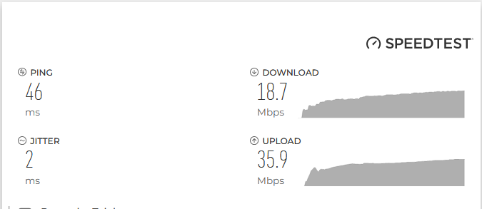 Habe den (Ookla) Speedtest laufen lassen und komme mit meiner 4G LTE-Modemverbindung (50 Mbps Tarif) des Routers (TP-Link Archer MR 600) auf 51.39 Mbps im Download und 10,63 im Upload, was mir aber (alleine) reicht. Der Ping war bei 31 ms, die Download Latenz bei 105 ms und die Upload Latenz bei 43 ms. An Hops sind es wohl 12 gewesen.