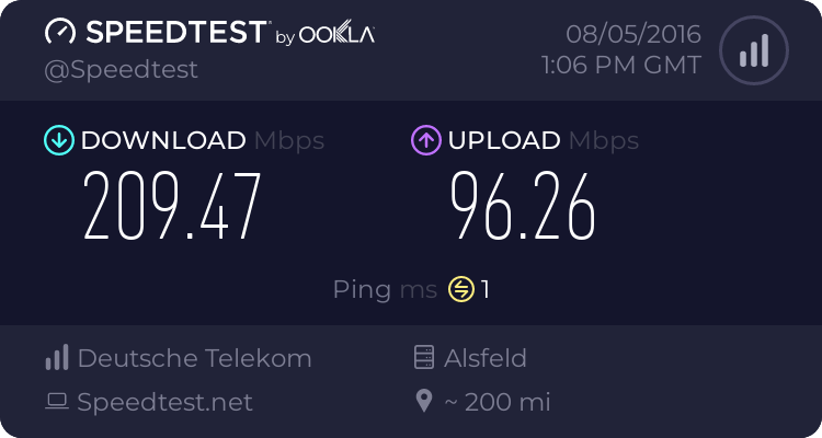 Bin seit unserem Umzug Anfang des Jahres bei einem lokalen Glasfaser Anbieter mit 1000Mbit down und 500Mbit Up.
