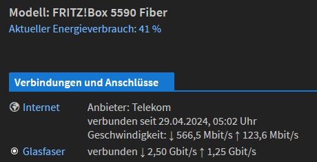 Hab das glück seit 2016 Glasfaser von der Telekom zu haben, damals noch mit 200/100 Mbit/s mehr ging zu dem Zeitpunkt nicht seit 2022 hab ich direkt die FRITZ!Box 5590 dran hängen und seit letztem Jahr Upgrade auf 500/100 Mbit/s für 51€ im Monat.