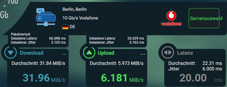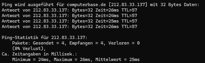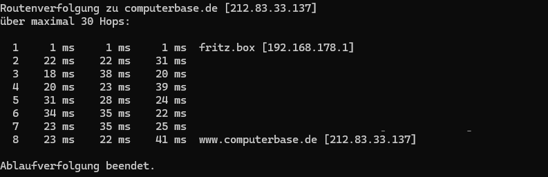 Ping wird ausgeführt für computerbase.de [2a00:f48:2000:1::137] mit 32 Bytes Daten:Antwort von 2a00:f48:2000:1::137: Zeit=5msAntwort von 2a00:f48:2000:1::137: Zeit=5msAntwort von 2a00:f48:2000:1::137: Zeit=6msAntwort von 2a00:f48:2000:1::137: Zeit=5ms7 Hops 6 7 ms 6 ms 6 ms ae2-0.gw01.fra01.net.23m.com [2a00:f48:100:0:8000::34] 7 6 ms 5 ms 5 ms [URL='http://www.computerbase.de']www.computerbase.de[/URL] [2a00:f48:2000:1::137]
