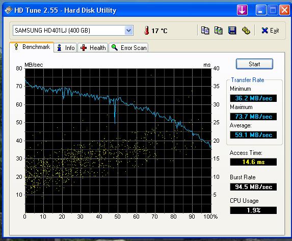 Jetzt habe ich auch eine Erklärung für meine erste Zeitmessung: Wie beiliegende Anlage zeigt bringt es meine eingebaute Backup HD: Samsung HD 401LJ 400GB in der Messung nur auf Average 59,1 MB/s. Die ist einfach nicht schneller, wenn der USB 3.0 nichts schnelleres kriegt, kann er auch nicht schneller sein. Somit waren meine gestoppten 60 MB/s nicht mal schlecht. (Siehe #45 und # 47)