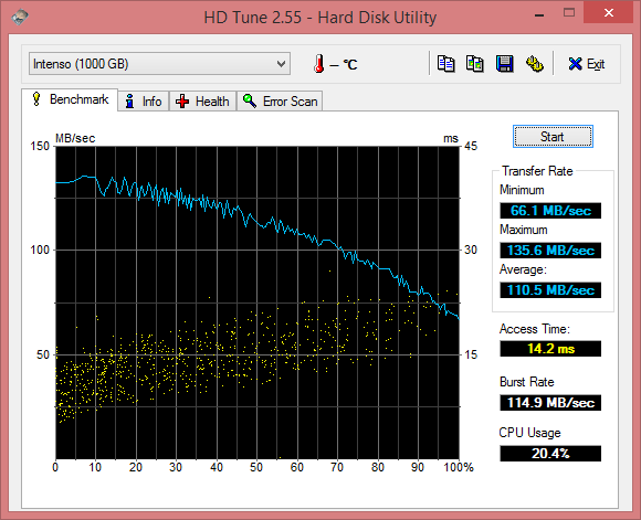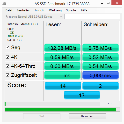 Ich verstehe nicht so ganz woran das liegt da ich das nicht reproduzieren kann. Im HD Tune wird mir die Intenso mit 110 MB/s angezeigt.