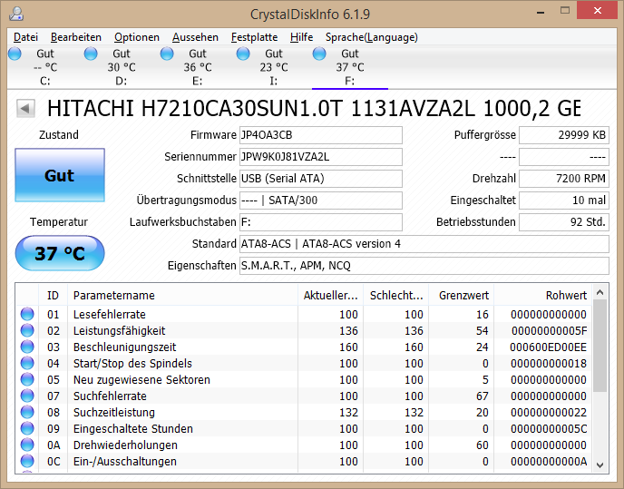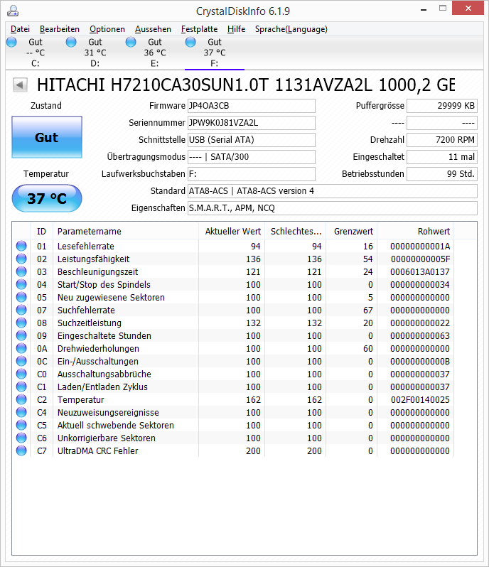 Der Unterschied zwischen der Lese- und der Schreibrate ist gravierend und untypisch für HDDs, da weichen die Wert i.d.R. nur wenig voneinander ab. Die S.M.A.R.T. Werte zeigen nur Lese- aber keine Schreibfehler, wie man es erwarten würde. Es gibt auch keine schwebenden Sektoren, die beim erneuten Schreiben ja erst wieder geprüft würden, was dann einen Unterschied erklären könnte.