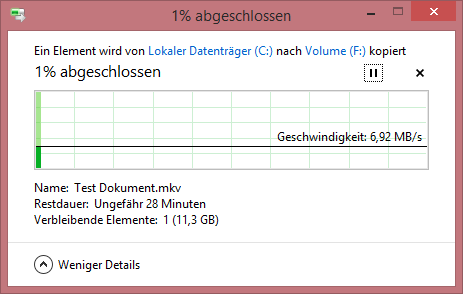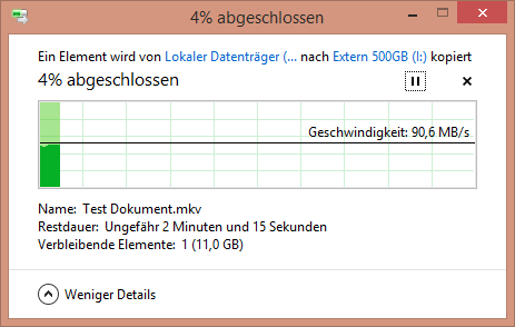 Wenn ich die gleiche Datei auch von meinem Rechner auf eine andere USB 3.0 Platte kopiere liegt die GEschwindigkeit bei 90 MB/s