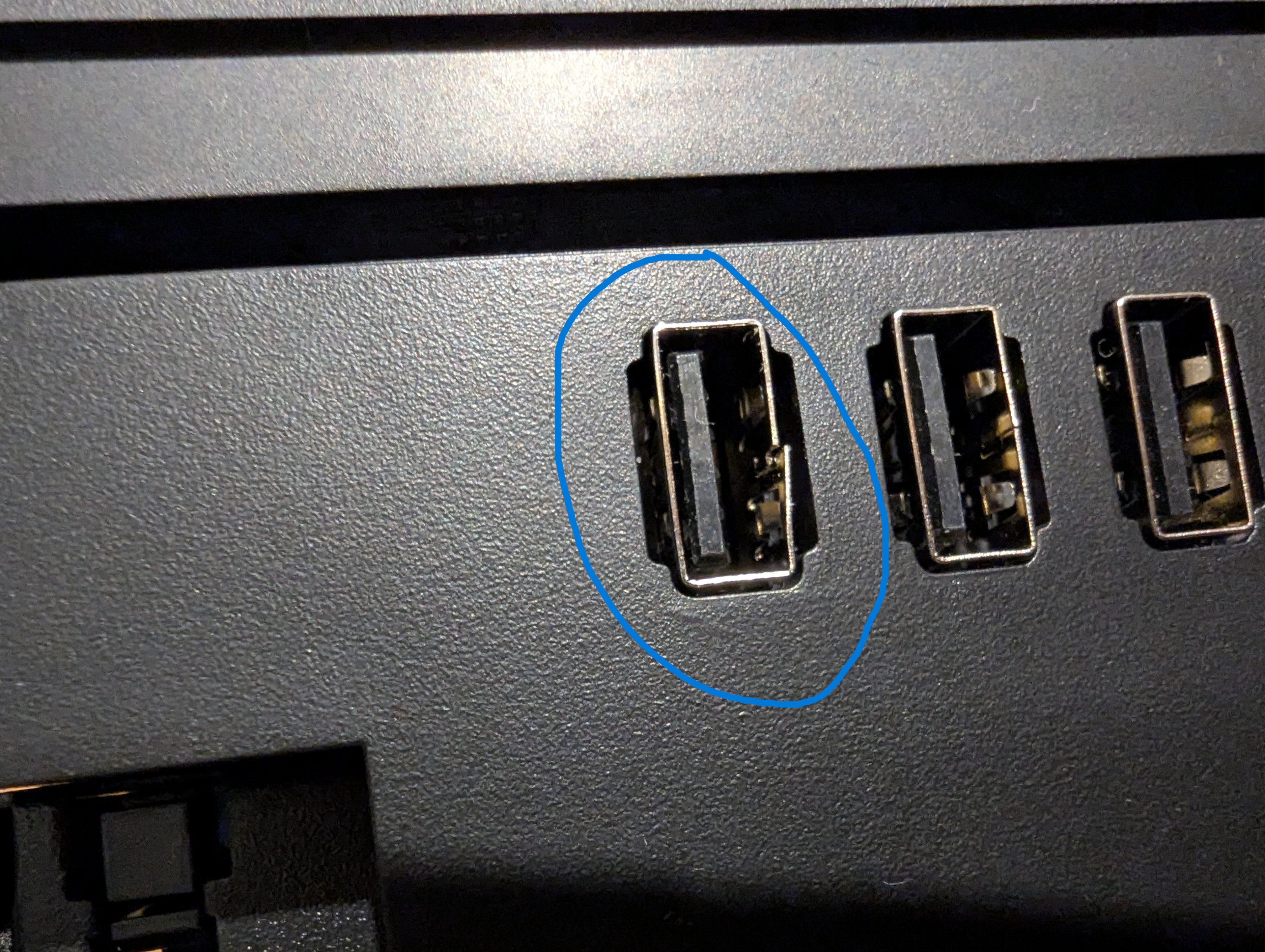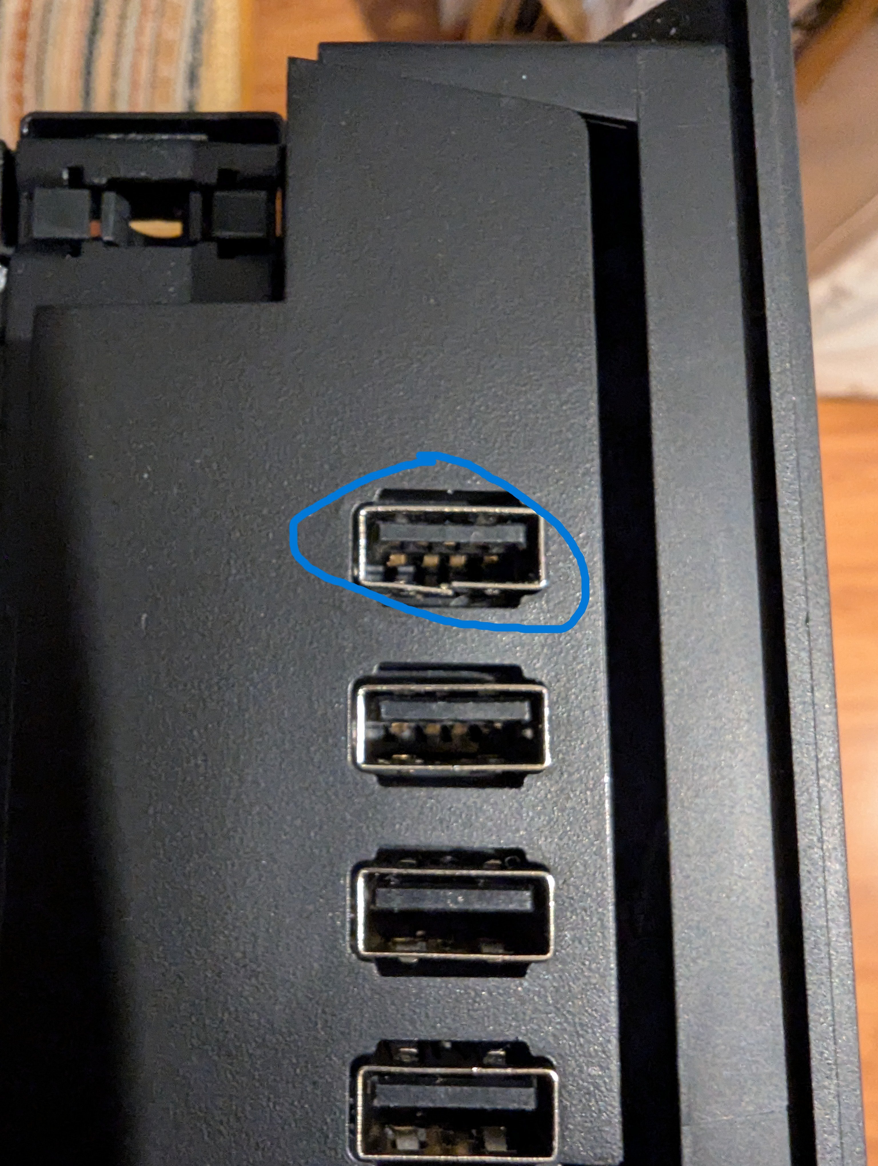Leider hat es oben bei einem USB-Port augenscheinlich mindestens einen Schönheitsfehler, wenn nicht eher einen Defekt.
