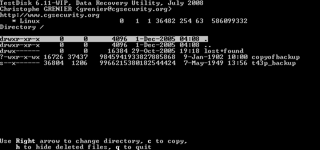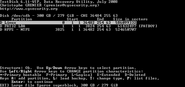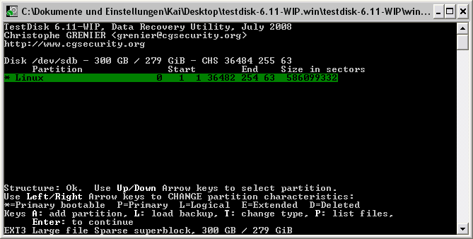 Die weitergehende TestDisk Analyse (QuickSearch) zeigt dann erstmal nur eine "Linux" Partition an (?)