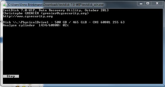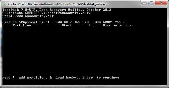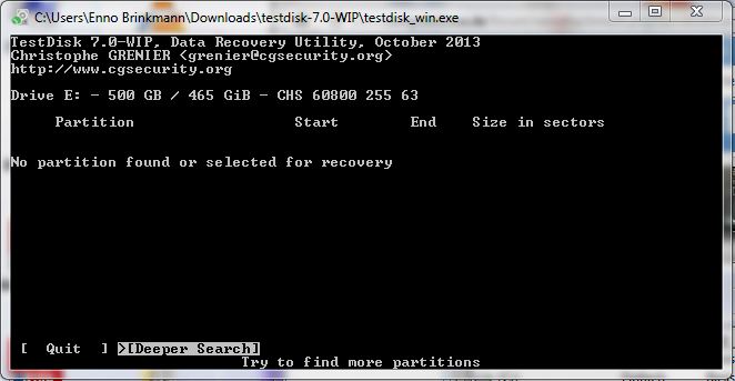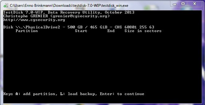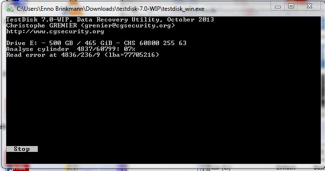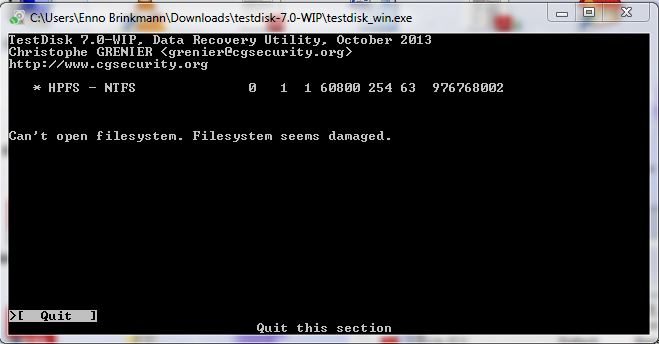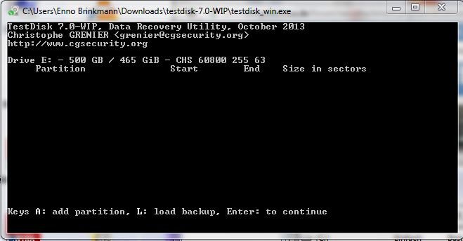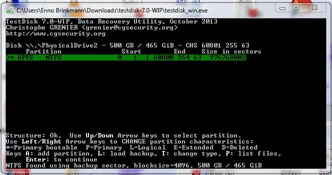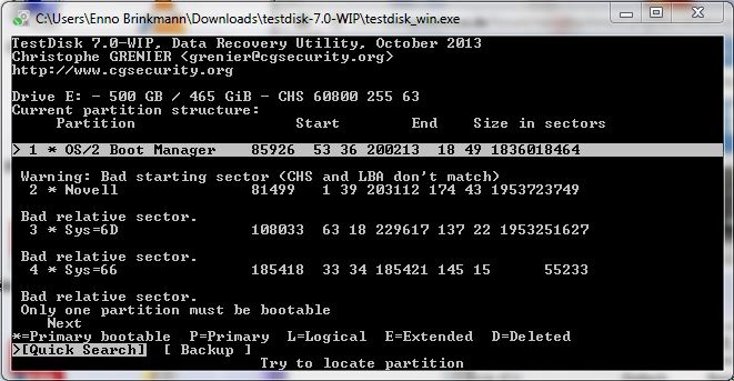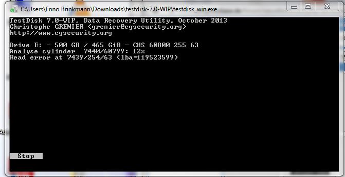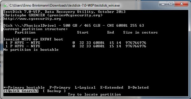 bei mir ist der SuperGAU eingetreten. Meine externe USB-Festplatte wird nicht mehr erkannt. Da auf ihr der aktuelle Stand meiner Diplomarbeit gespeichert ist, versuche ich mich seit Anfang der Woche an TestDisk. Bisher leider ohne Erfolg. Ich hoffe ihr könnt mir helfen.