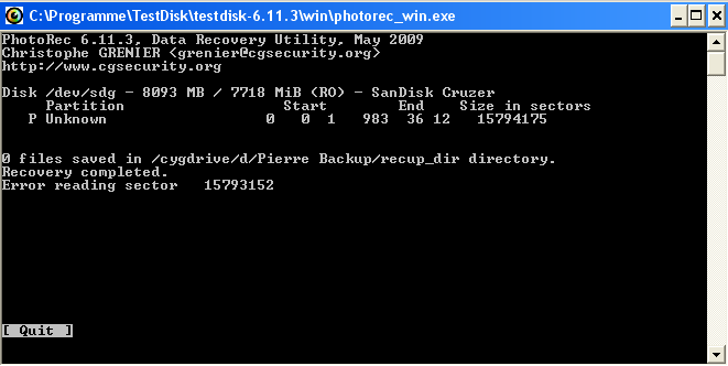 Mit PhotoRec in Windows XP habe ich auch probiert, Dateien zu retten, leider wurden "0 files" gefunden