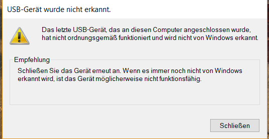 wie kann ich die Fehlermeldung "Das USB Gerät wurde nicht erkannt" löschen. Erhalte alle paar Sekunden die Meldung. Nach dem Neustart komm sie immer wieder