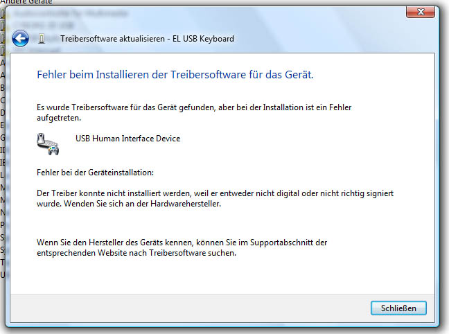 plug&play erkennt die tastatur als HID-konformes gerät und versucht den nötigen treiber zu installieren. treiber wird geladen doch dann springt die fehlermeldung auf dass der treiber nicht installiert werden konnte. mit dem grund dass der treiber nicht digital oder nicht digital signiert sein soll (bild im anhang). sonderbar ist jedoch dass alle weiteren USB eingabegeräte die ich anschliesse ebenfalls diesen fehler zeigen wenngleich sie noch vor wenigen tagen problemlos funktionierten.