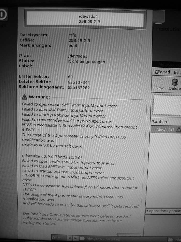 und GParted meint das der $MftMirr inode nicht geöffnet werden kann )