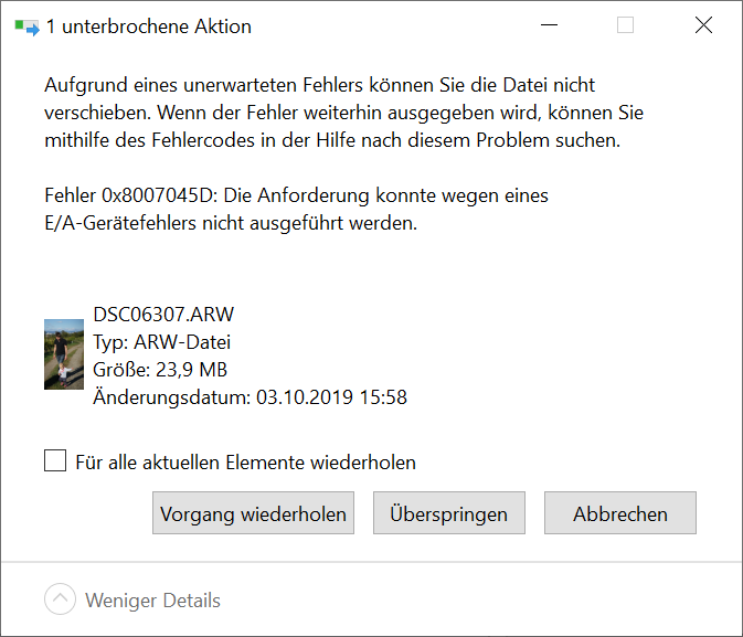 Diese erreichen alle mit verschiedenen USB-Sticks nur eine Geschwindigkeit < 1 MB/s. Weiter gibt es beim Kopieren von Dateien zwischendurch immer wieder Fehlermeldungen, entweder: