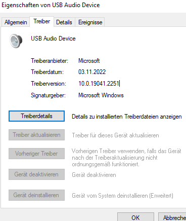 In der Anleitung steht, dass die Soundkarte als C-Media angegeben wird. Bei mir steht aber nur USB Audio Device: