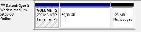 Windows kann nicht mit mehr als einer Partition auf USB Sticks umgehen. Du brauchst ein Tool, womit Du auf dem Stick wieder eine 64 GB Partition erstellen kannst.