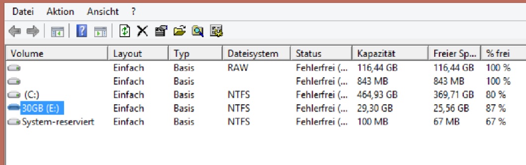 Das ist doch schon sehr hilfreich, denn die Größe (30GB, was eigentlich 30GiB sind), passt zu einem 32GB Stick. Wenn es also ein 32GB Stick ist, so müsste er eigentlich im Explorer als E: erscheinen. Oder ist es ein 128GB Stick? Dann wäre er wohl der erste Eintrag in der Liste, der wo RAW steht, es ist eben meistens Hilfreich mehr Informationen zu haben und auch den unteren Teil der Datenträgerverwaltung sehen zu können, statt immer raten zu müssen.