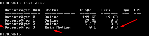 Unter der Datenträger-Verwaltung wird er zwar Angezeigt, jedoch als, ich weiß nicht so genau aber ich denke als leeres oder unbekanntes Medium (Siehe Bild).