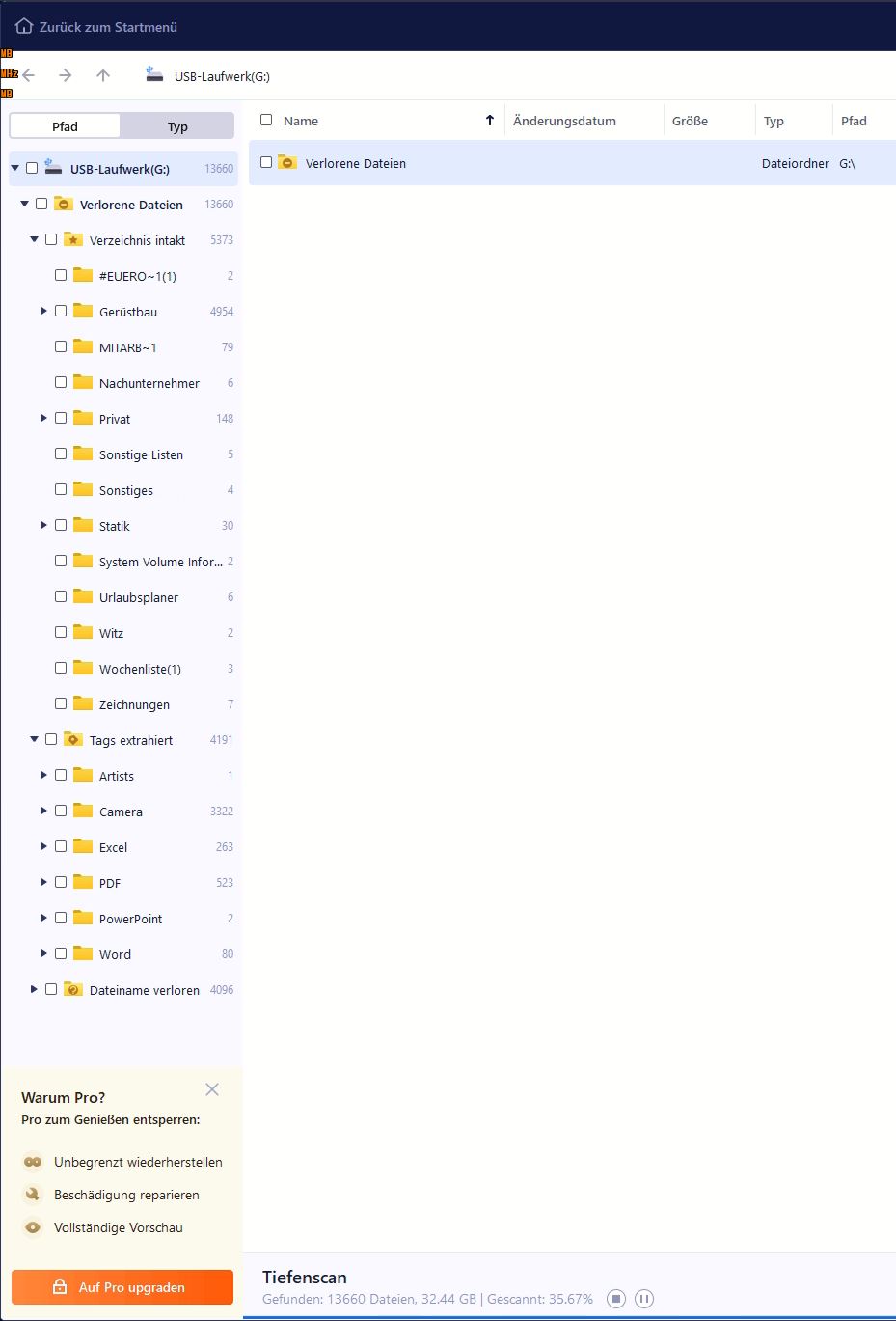 Daraufhin habe ich das Programm "Ease Data Recovery" installiert. Hier habe ich festgestellt, dass der USB Stick mit samt seinem Inhalt angezeigt wird inkl. Ordner, Unterordne rund Dateien. Leider kann hier wohl nur die kostenpflichtige Version alles wiederherstellen.