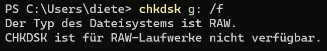 - Die ersten Recherchen im Netz brachten leider kein Erfolg (chkdsk g: /f = CHKDSK für RAW-Laufwerke nicht verfügbar)