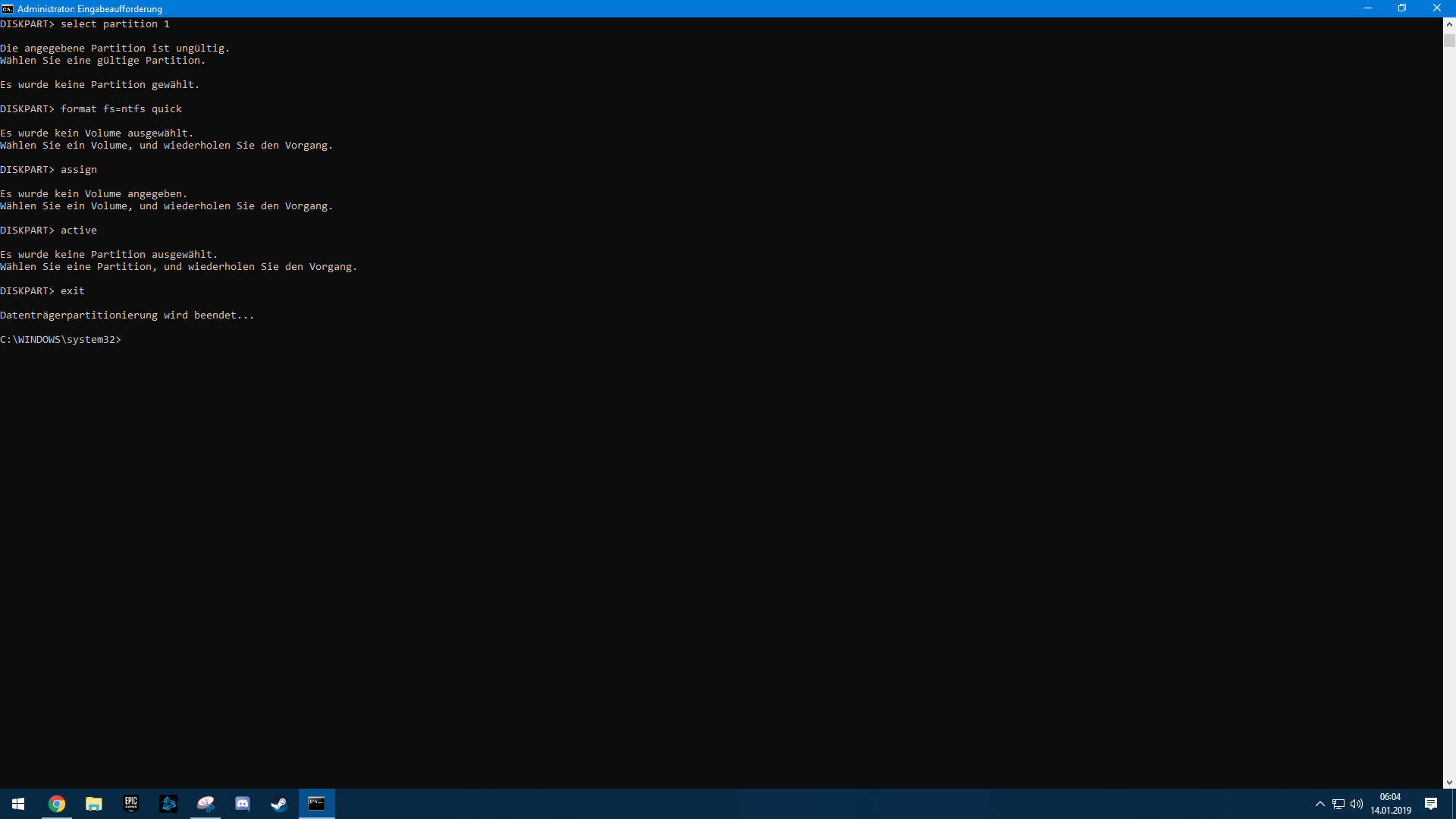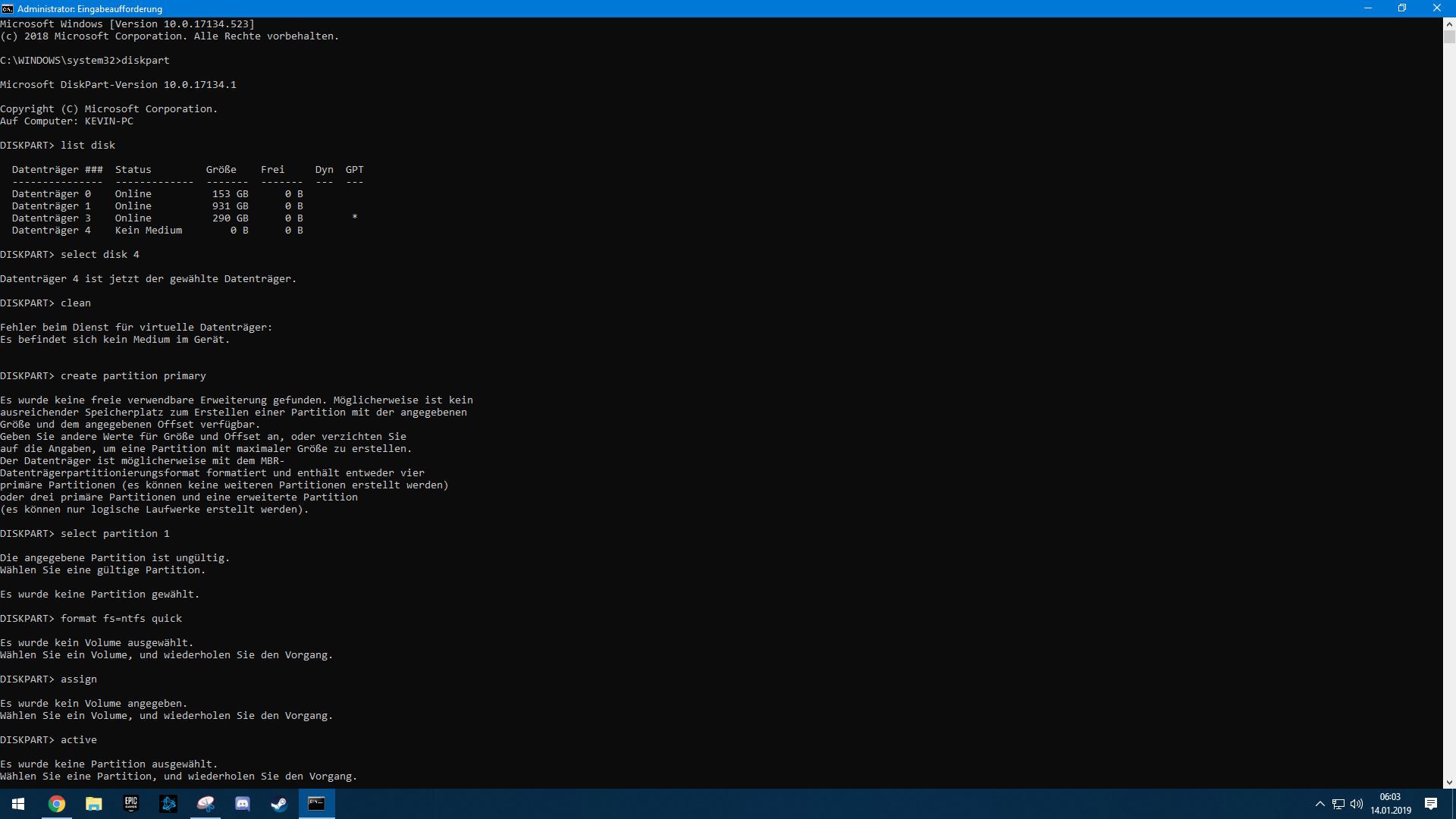 Leider konnte ich die Installation, nachdem sie fertig war nicht beenden oder bestätigen, da ich solange weg war, dass mein Bruder meinen PC abschaltete. Daraufhin wollte ich meinen PC wieder starten und herausfinden ob wirklich alle Dateien nun auf dem Stick sind und hoppla, der USB Stick wird mir nicht im Windows Explorer angezeigt, bei der Datenträgerverwaltung wird angezeigt es ist "kein Medium" und Diskpart sagt: Es befindet sich kein Medium im Gerät.