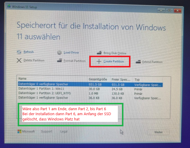 Dann Partition 6, wo jetzt Windows 11 drauf ist, bei der Installation wieder gelöscht habe, dass da Windows 11 Platz hatte um installiert zu werden.