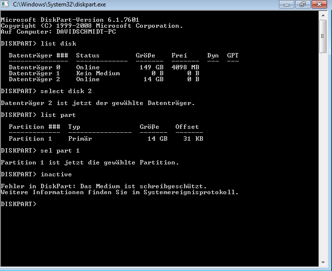 also, ich habe denn USB Stick San Disk Cruzer Slice 16 GB und habe von diesem aus mal Windows 7 installiert. Ich habe danach alles vom Stick gelöscht, aber ohne Formatierung sondern nur so. ( habe ihn mit diskpart.exe bootfähig gemacht ) Ich habe dann mal eine Power Point Präsentation darauf gespeichert. Als ich diese aber dann löschen wollte stand da der Stick wäre schreibgeschützt. Habe dann eine Formatierung mit dem Windows Formatierungs Tool versucht was nicht ging. Habe dann das selbe mit dem HP Tool gemacht. Auch keine Funktion bei beiden Versuchen Meldung : Stick Schreibgechützt. Habe auch versucht ihn erneut bootable zu machen auch da die Meldung der Stick sei Schreibgeschützt.