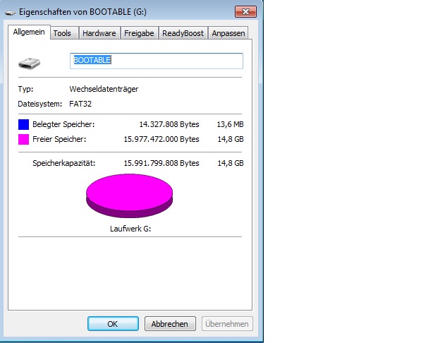 Es ist auch nicht bei den Eigenschaften denn Schreibschutz aufzuheben. Hat der Stick denn vielleicht einen Schreibschutz Schalter ? Der Stick heißt auch noch immer BOOTABLE, Namensänderung nicht möglich.