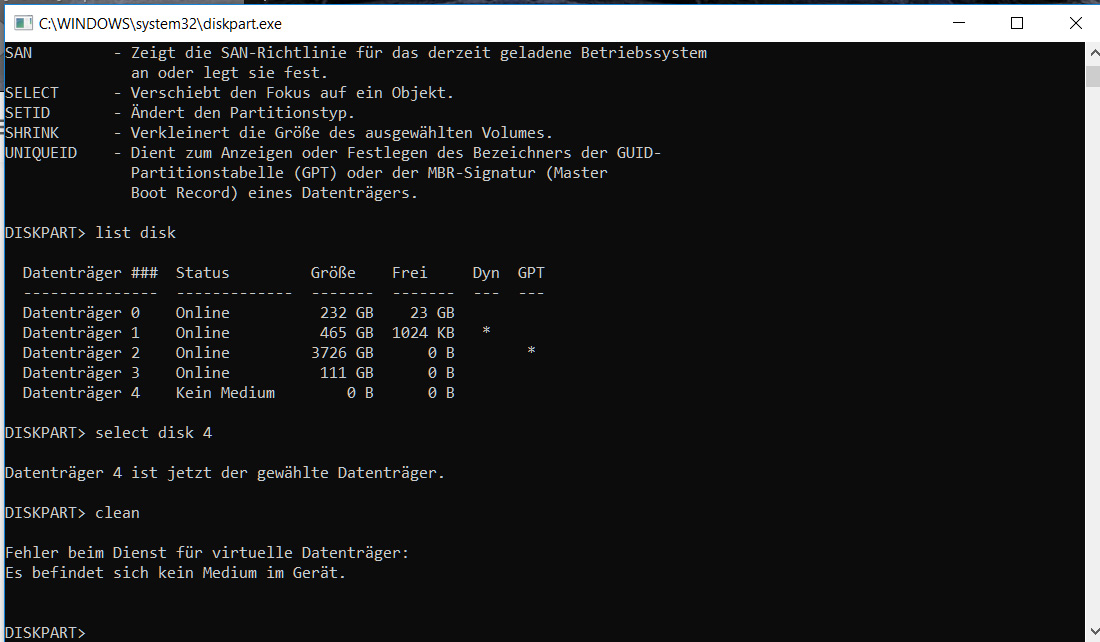 Auch per diskpart (siehe Foto) ist er da, aber kein Medium.