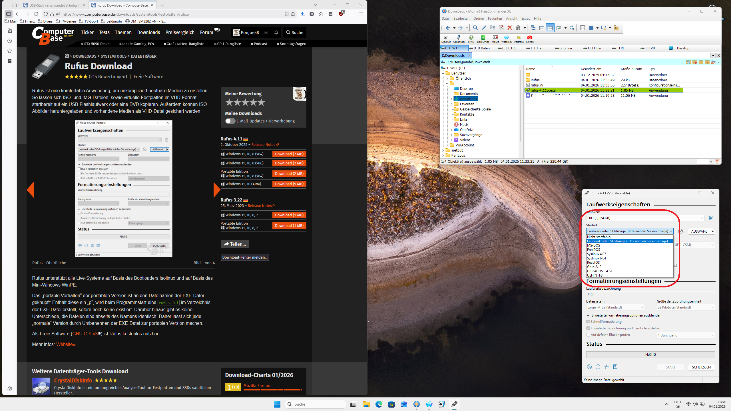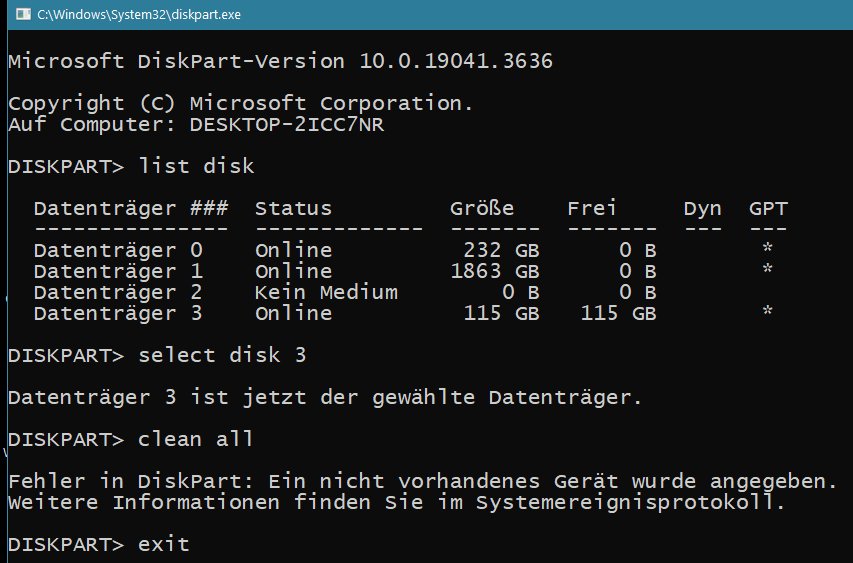 Gerade wollte ich ein Programm von einer .ISO-Datei installieren. Der Windows-Explorer (Windows 10 Pro) zeigt links die beiden Laufwerksbuchstaben an, rechts ebenso. Beim Mausklick auf die .ISO-Datei verschwindet der Mauszeiger, der Desktop ist eingefroren, STR+ALT+ENTF funktoniert nicht. Nach dem Neustart kommt unten rechts eine Fehlermeldung, der USB-Stick sei fehlerhaft und müsse überprüft werden. Rechter Mausklick, Eigenschaften, Tools, Prüfen. Das Fenster geht auf, der Mauszeiger verschwindet, Stillstand. Mit ALT+F4 wird der Windows Explorer geschlossen. Stick rausziehen, Stick reinstecken. Der Stick erscheint in der Datenträgerverwaltung. Mit Mausklick auf die Daten-Partition verschwindet das Laufwerk (mit den 3 Partitionen) aus der Anzeige, der Mauszeiger ist verschwunden. Etliche Wiederholungen.