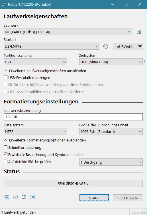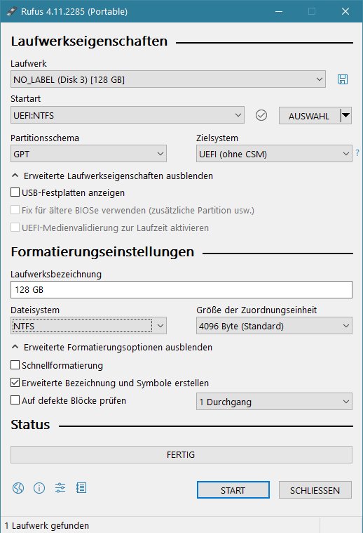 Ein neuer USB-Stick "Patriot Supersonic Rage Pro 128 GB" wurde mit Ventoy formatiert. Eine Partition für .ISO-Dateien und eine Partition für Daten. Ohne mein Zutun wurde mittig noch eine dritte Partition angelegt: VTOYEFI, 32 MB FAT, Fehlerfrei (EFI-Systempartition). Es wurden von mir einige .ISO-Dateien in die erste und einige Tools und Dokumente in die zweite Partition kopiert.