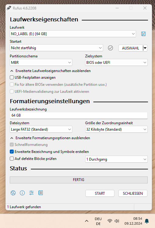 Nach ca. 2 Stunden habe ich die Konvertierung abgebrochen (weil sie ja offensichtlich zu lange dauerte), seitdem wird der Stift als "schreibgeschützt" angezeigt. Dateiinhalte werden nicht mehr angezeigt (keine Angst, ich habe sie vorher gesichert).