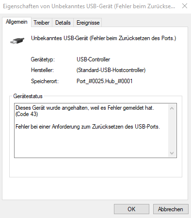 Du hast es direkt am Mainboard und nicht an einem Gehäuse-USB-Anschluss dran?
