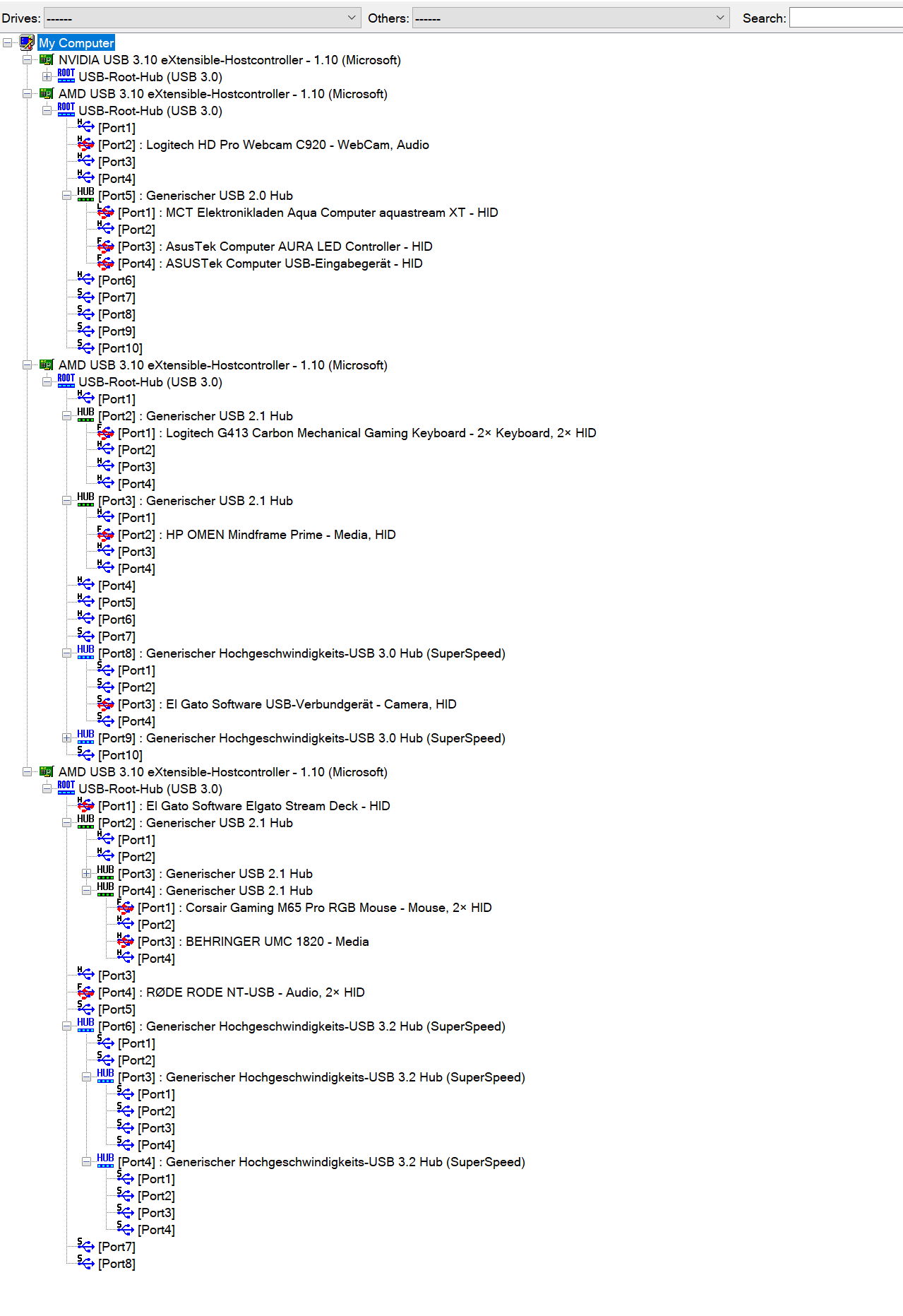 Ich habe dann per USB Tree View versucht rauszufinden, an welchem USB Controller diese Geräte hängen, werde aber irgendwie nicht schlau draus. Einige USB Geräte sind ab Boot schon da, andere kommen während des Booten (noch nicht im Windows, also noch Mainboard Ebene) dann nacheinander hoch.