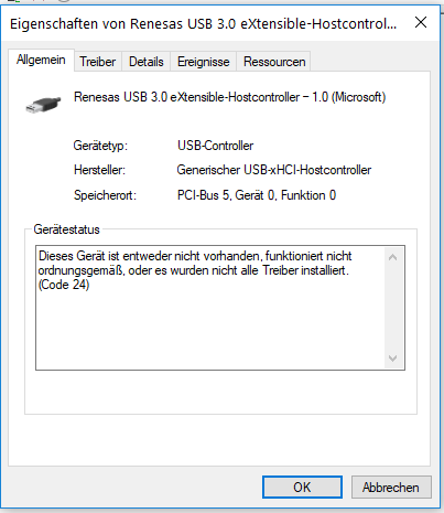 Im Gerätemanager wird die Karte dann mit einem gelben Ausrufezeichen geführt und in den Details steht: Dieses Gerät ist entweder nicht vorhanden, funktioniert nicht ordnungsgemäß, oder es wurden nicht alle Treiber installiert. (Code 24)