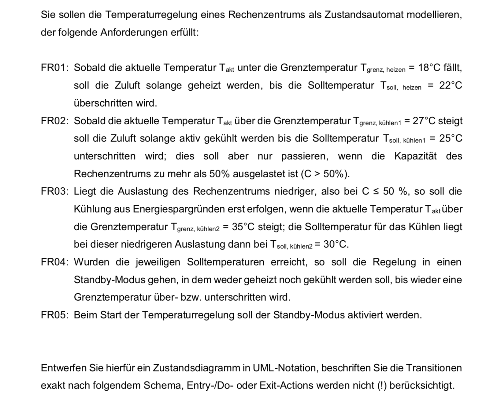 z.B. "Unter der Annahme, dass das RZ in einem Notfallszenario herunter gefahren werden muss, ist ein Abschalten der Temperaturregelung vorgesehen" Und damit hätte ich dann auch meine "stand by loop", meinen Endzustand und meine 12/10 Extrapunkte