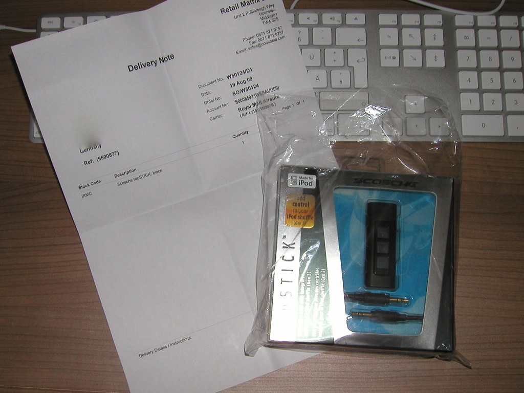 Nachdem ich im MacUser Forum den Tipp erhielt, der Scosche tapSTICK sei über scoschedirect.co.uk bestellbar habe ich nicht lang gezögert, denn mein shuffle wartet schon lange darauf mein Begleiter während meiner Radfahrten zu werden.