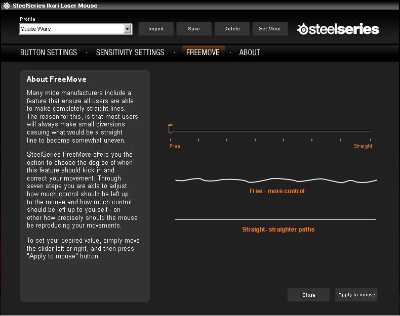 Die meisten anderen Mäuse (Razer Lachesis afaik nicht, G9 über Treiber deaktivierbar, thx @Laxer) "glätten" Mausbewegungen damit man besser eine gerade Linie ziehen kann (Prediction). Das verfälscht natürlich die Mausbewegung und kostet Präzision. SteelSeries läßt mit ihrer sogenannten FreeMove-Technologie die Glättung in 7 Schritten einstellen. Man merkt den Unterschied, läßt sich am besten mit Paint testen. Für mich muß ich noch die beste Einstellung finden, im Moment hab ich es komplett aus, damit komm ich sehr gut zurecht.
