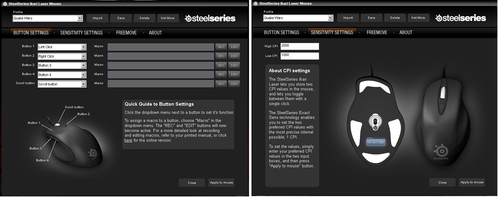 Hat bei RtCW perfekt funktioniert, bei ET:QW leider nicht, entweder war ich zu blöd oder es liegt am Game. Hab die Sensitivity bzw. CPI dann einfach on-the-fly eingestellt, funktioniert sehr einfach (CPI werden am LCD-Display angezeigt).
