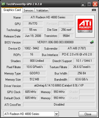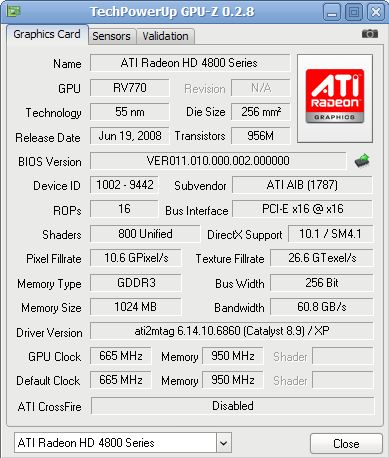 ersten Werte zu Lautstärke und Temperatur wurden mit dem mitgelieferten Treiber vorgenommen (ATi Catalyst 8.6). Die Werte sollten ja nicht abweichen von dem System mit neuem Treiber. Die Benchmarks wurden mit dem zur Zeit der Tests aktuellen ATi Catalyst 8.9 durchgeführt.