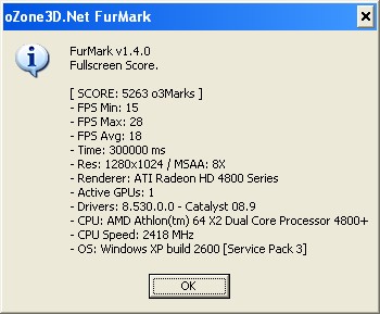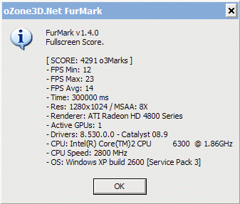 Furmark laufen lassen (1280x1024; 8xMSAA; umbenannt wurde nichts). Bei 5 min kamen 5466 Punkte raus (FPS AVG: 18), bei 10 min (4xMSAA) waren es 16947 Punkte. Zum Vergleich: Meine Laptop-GPU (Geforce 8600M GS) schafft bei 5min, 4xAA und 1024x768 gerade einmal 1850 Punkte (FPS AVG: 6). Im Test konnte meine neue GPU die alte um das dreifache schlagen. Zugegeben der Vergleich hinkt, da es sich um eine Laptop-GPU handelt.