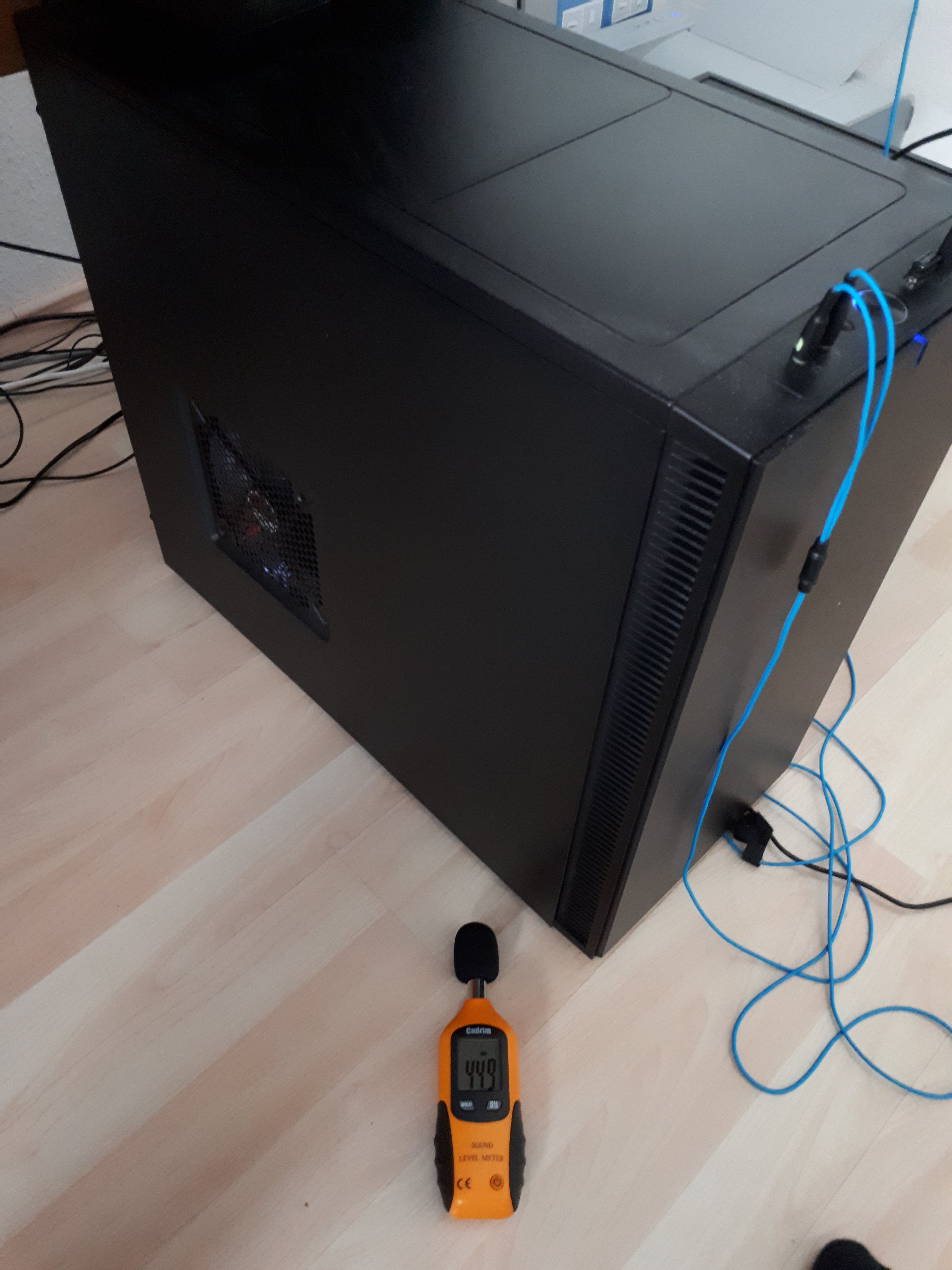 Für die Messung der Lautstärke habe ich mangels eines professionellen Messgeräts die App „dB Meter“ auf meinem iPhone XS verwendet und alle Messungen aus ca. 35cm Entfernung durchgeführt. Da das Gehäuse auf meinem Schreibtisch steht kommt das der wahrgenommenen Lautstärke auch durchaus nahe.