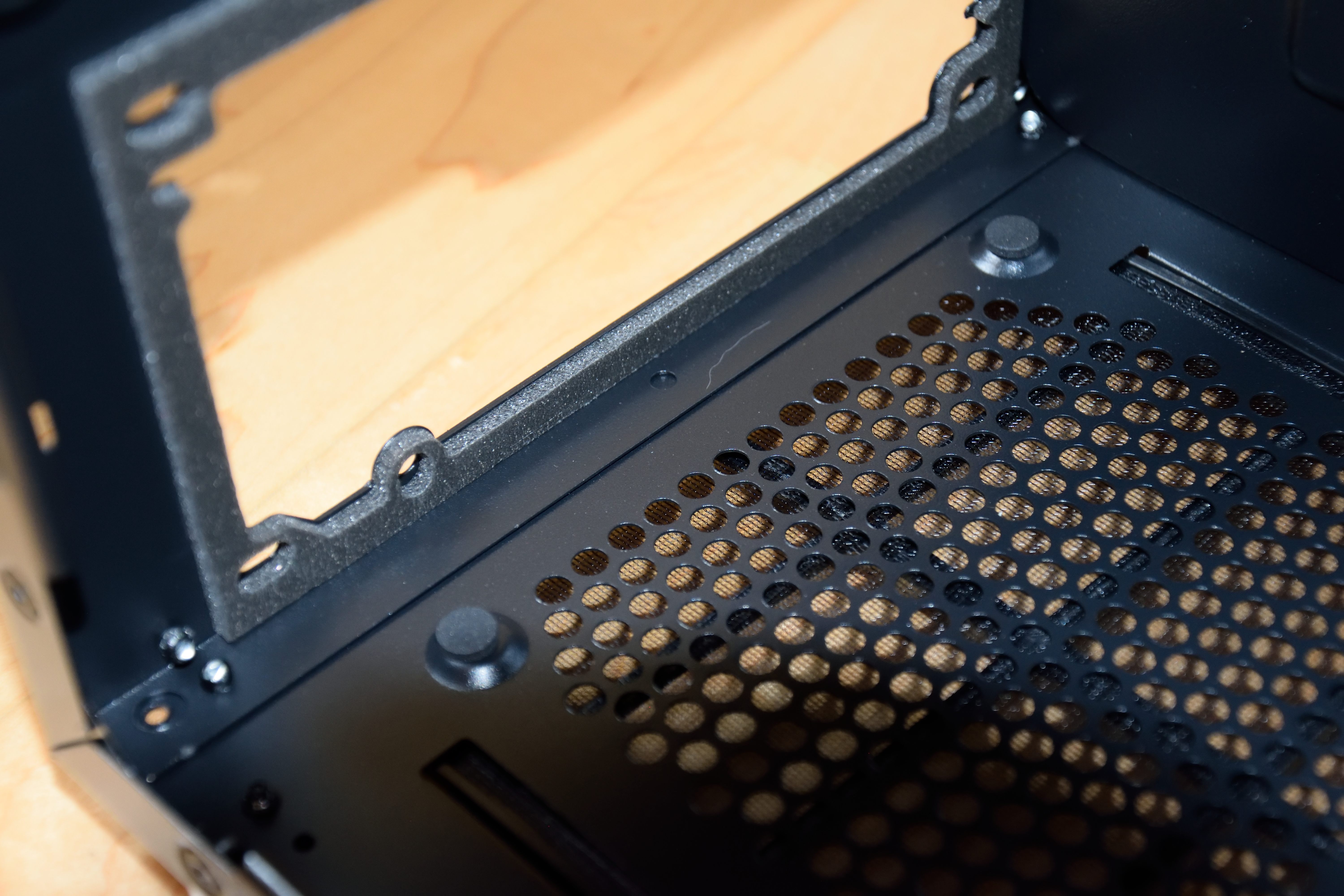 An vielen Kleinigkeiten merkt man, dass es sich um ein Gehäuse für gehobene Ansprüche handelt. Sowohl im Heck als auch im ODD-Käfig sind Bohrungen zur Schlauchdurchführung vorhanden und auch Details, wie die Entkopplung des Netzteils durch gummierte Auflager und einen Gummirahmen im Heck, fallen positiv auf.