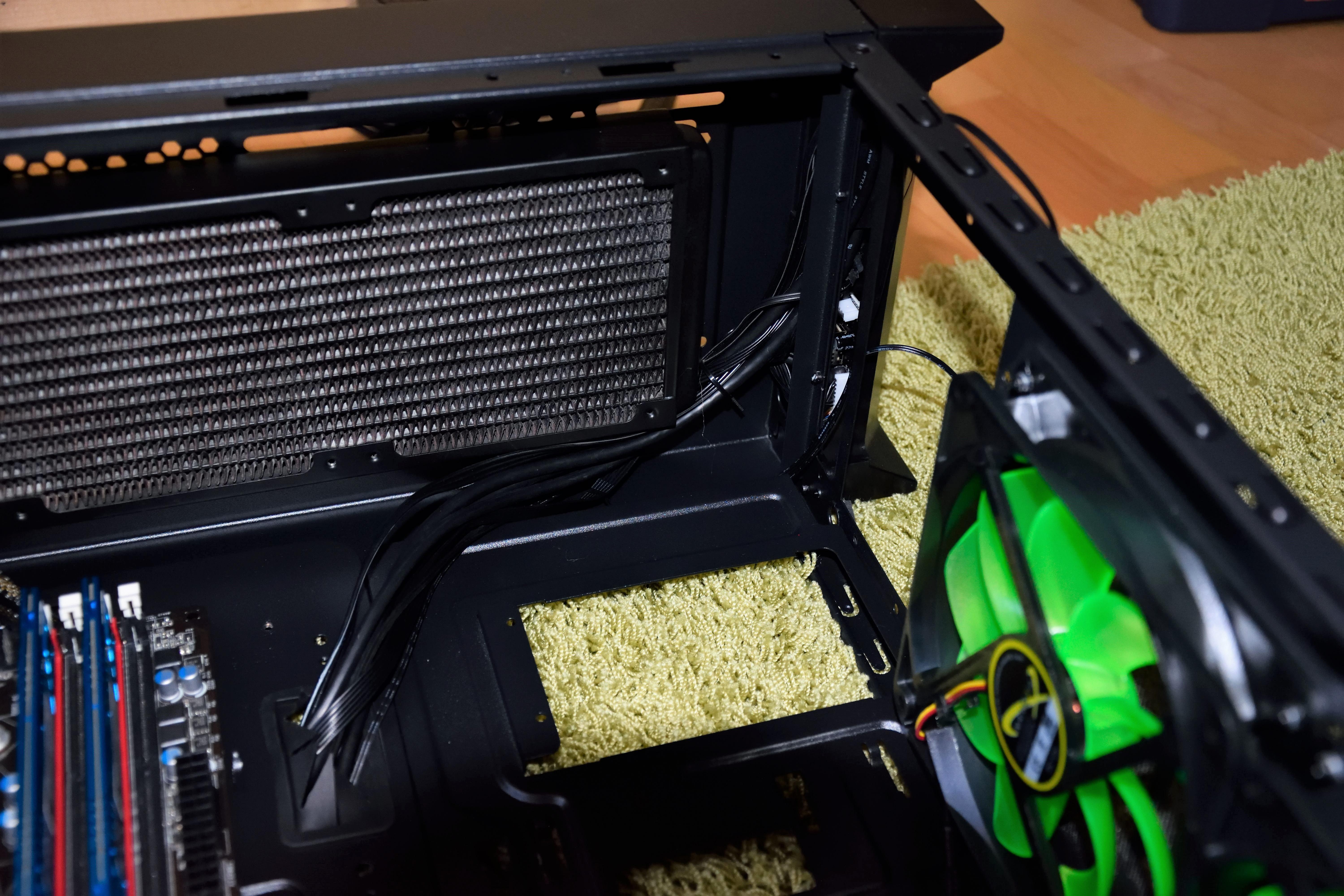 Mit verbauter Wasserkühlung samt Radiator im Deckel sieht die Sache wieder anders aus. Im Test sind an einem 360er Radiator drei Lüfter im Push-Betrieb installiert. Dadurch ist ein sehr leichter aber spürbarer sog u.a. auch am Gehäuseboden wahrnehmbar. Hier sollte zur Staubvermeidung selbst nachgebessert werden.