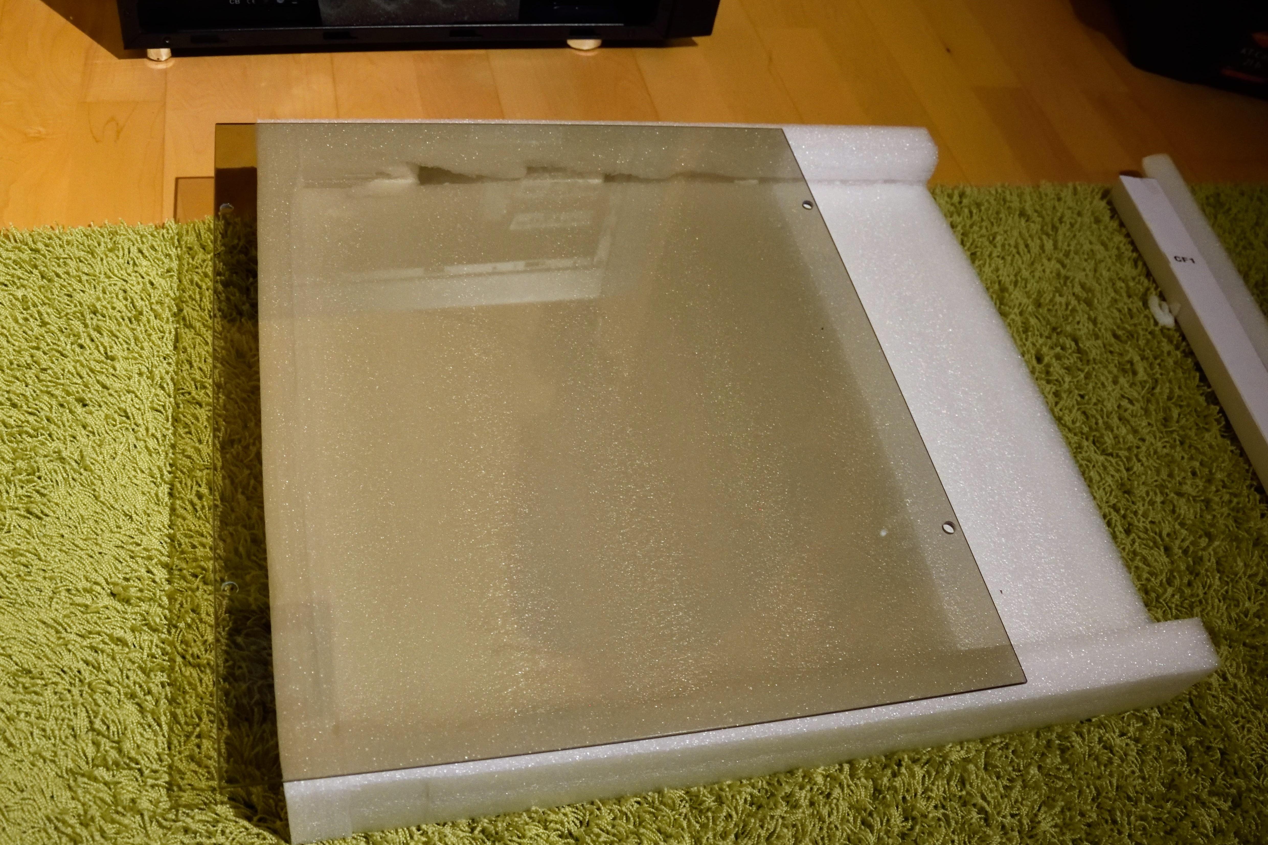 Das Seitenteil aus Glas kommt ebenfalls in einer dicken Schaumstoffumhüllung daher. Da es sich nicht um Acrylglas handelt sondern um echtes Glas, ist dies auch nötig. Auch hier findet sich in einem extra Karton das Montagematerial bestehend aus vier Schrauben samt gummierten unterlagen und vier Moosgummis, die auf das Gehäuse geklebt werden.
