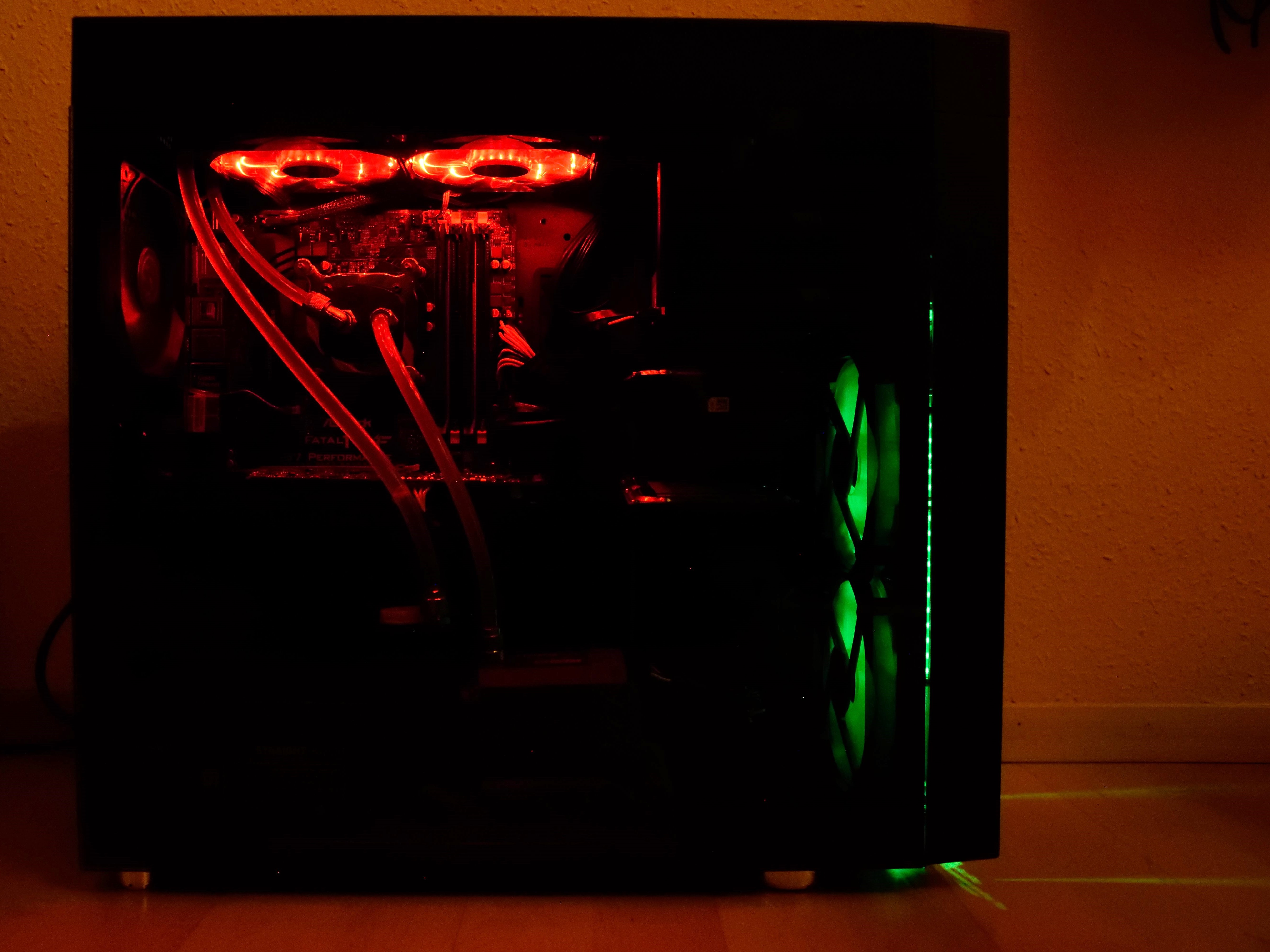 Erst durch das Tempered Glass entfaltet das CoolForce 1 seine ganze Pracht. Zuvor noch schlicht und elegant, wirkt es jetzt sehr edel. Durch den Verzicht eines großen und klobigen HDD-Käfigs kommt der viele Freiraum perfekt zur Geltung. Besonders im dunklen, wenn die Frontlüfter durch die LED-Leisten beleuchtet werden, entsteht eine klasse Lichtstimmung. Allerdings gelang nicht viel Licht der ansonsten sehr hellen LEDs ins Innere des Gehäuses. Für Fans von Beleuchtung im PC sind daher zusätzliche Lichtquellen Pflicht.