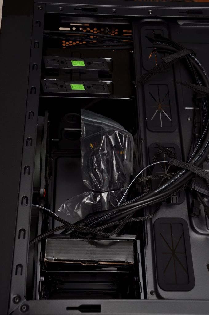 Über dem HDD-Käfig befinden sich direkt ein Freiraum, in den man z.B. eine WaKü-Pumpe verstecken könnte, oder, wie ich es getan habe, ein Teil des Kabelsalats versteckt wird.