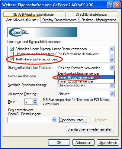 Ich habe das Problem das wenn ich auf 16bit stelle er die Einstellungen nicht übernimmt, er springt dann egal was ich drücke wieder auf 32bit.