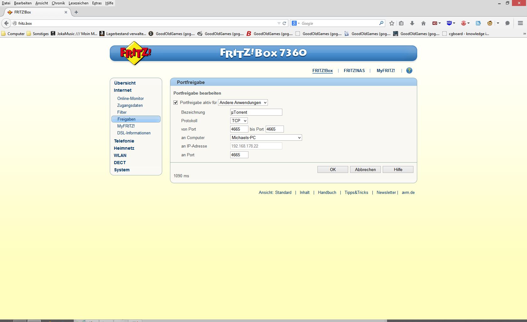 Hier mal die Einstellungen in der FRITZ!Box, Windos Firewall und uTorrent: